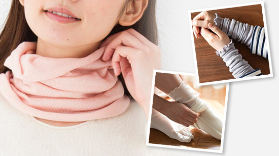 首 | マフラーやネックウォーマーで外気に触れないようにしましょう。肩こりなどを感じやすい方は首を回たりストレッチを行うのも効果的。自宅ではホットタオルを作って首元を温めるとリラックス効果も高まります。 |