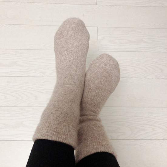 ラムウール!とにかく温かいです。ただし、私は少しチクチクを感じてしまうので、薄手のシルクまたはコットンの上のカバーソックスとして活用しています。フローリングからの底冷えも感じにくくなるので、お家タイムに重宝しています。