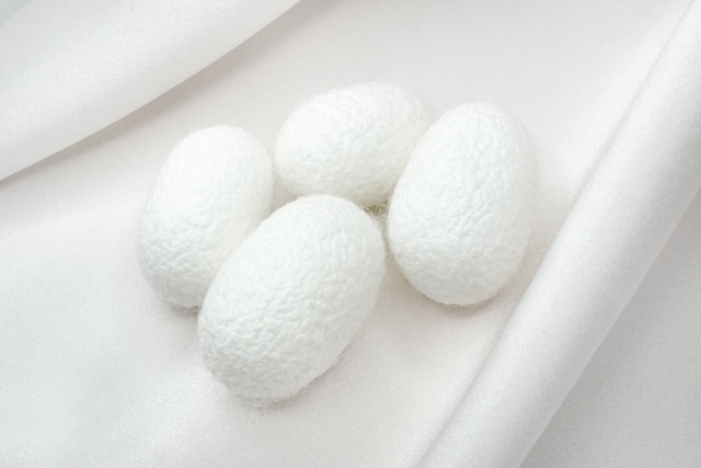 シルク:蚕の繭からつくられる動物性繊維で、天然のタンパク質繊維