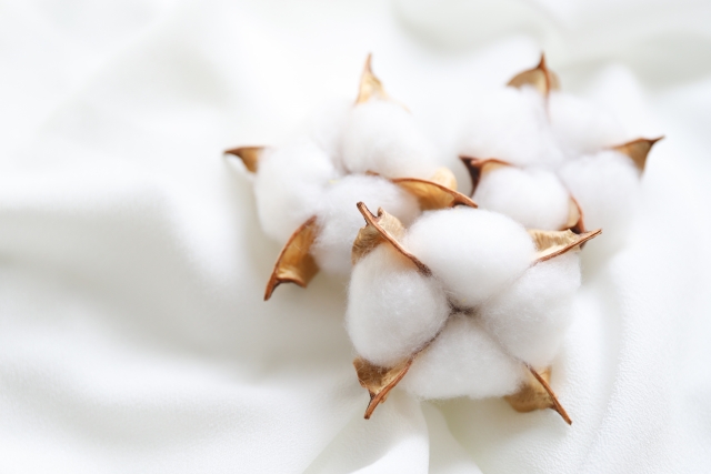 コットン:木綿の「ワタ」から採取される繊維で植物性繊維