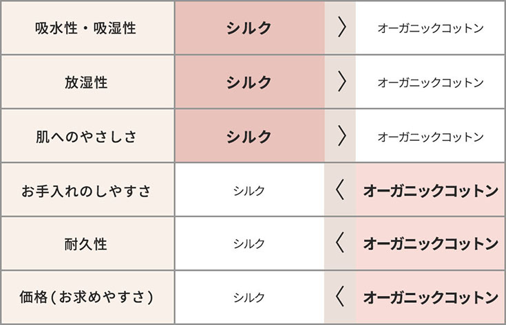 「シルク」と「オーガニックコットン」それぞれの特徴を参考に、用途や好みにあった商品をお選びください。