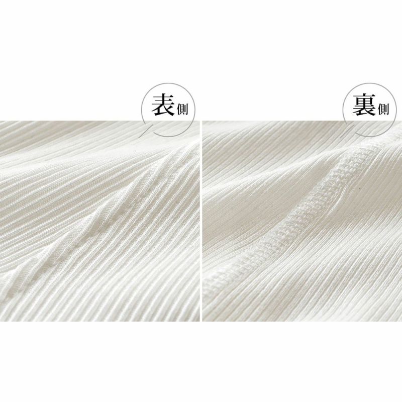 ほのかな光沢感が上品なコットンシルクのテレコ生地。テレコ素材とは凹凸のあるリブ織りの一種で、リブの凹凸が同じ数になっていて、はっきりとうねが分かるように織られています。 伸縮性がよくさらりとした肌触りで、シルク生地のなかでも比較的毛玉になりにくい素材です。