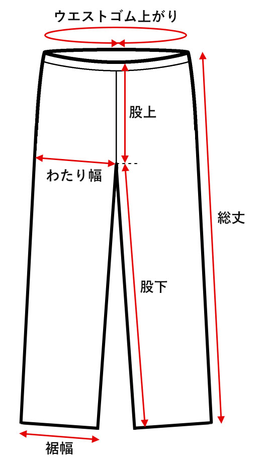 ●総丈 ウエストサイド上端から裾までを直線で計測した値 ●股上 前身頃の股下縫い合わせ部分から上端までを直線で計測した値 ●股下 前身頃の股下縫い合わせ部分から裾までを縫い目に沿って計測した値 ●わたり幅 股合わせ部分を水平に計測した値 ●裾幅 裾部分の幅を直線で計測した値 ●ウエストゴム上がり ウエストゴム部分の左右の幅を計測して2倍にした値 |