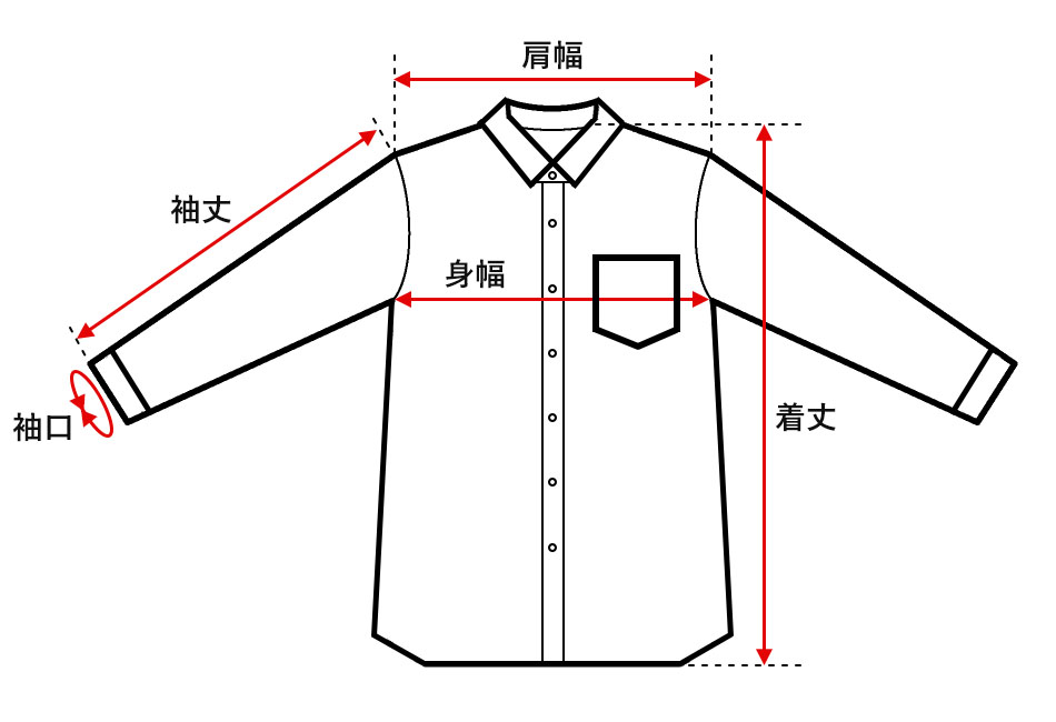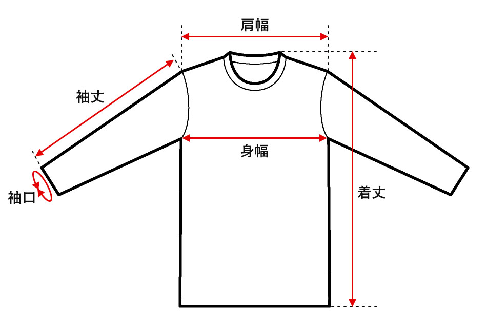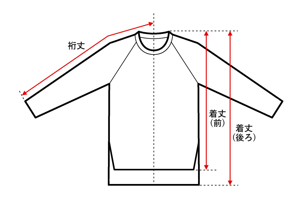 ●着丈 サイドネックポイントから裾までを直線で計測した値 ●身幅 脇下の縫い合わせ部分を直線で計測した値 ●肩幅 左右の肩先、切替部分の縫い目を直線で計測した値 ●袖丈 肩の切替部分から袖口までを直線で計測した値 ●袖口 袖口部分の幅を直線で計測して2倍にした値 |