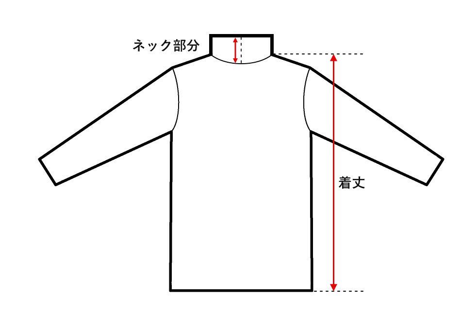 ●着丈:サイドネック部分(襟ぐりと肩の縫い目が交差する箇所)から裾までを直線で計測した値 ●ネック部分:ネック部分の前中心を計測した値 |