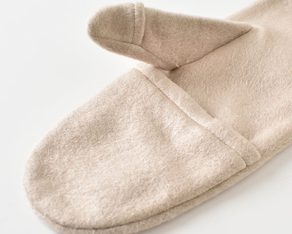 とても珍しいシルク100%のフリース生地。シルク糸にふわふわ加工を施し、肌触りがきめ細かくとても滑らかに仕上がっています。ウールのようなチクチク感が全くないので、敏感肌の方にもおすすめ。薄手で軽いのにあたたかく、シルクの優れた吸放湿性で蒸れずに快適です。