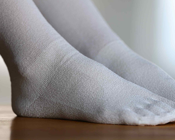 指先内部のパーテーションが足指を1本1本包み込み、締め付けることなく、指先を開放してリラックスできます。 足首からレッグ部分は透明感のある薄地に切替わるデザインです。