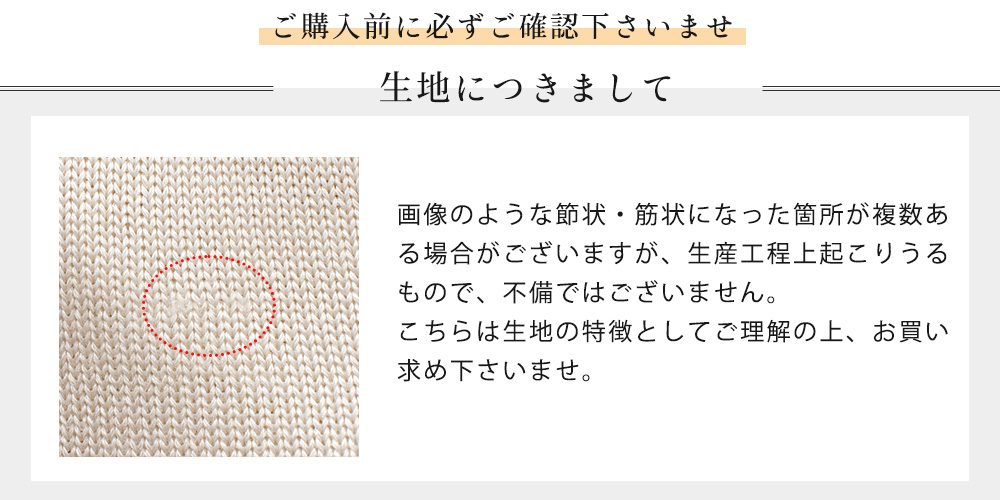 ・摩擦等によりピリング(毛玉)が発生します。毛玉ができた際には、毛玉取り器等で処理して下さい。 ・濃色の物は水濡れや強い摩擦により色落ちする事があります。 ・直射日光や蛍光灯の長時間の照射により色褪せする場合がございますのでご注意ください。 ・アクセサリー等による引っかけにご注意ください。 ・天然繊維の性質上、お洗濯の際にどうしても縮みが起こる可能性がございます。何卒ご了承下さいませ。また、大変デリケートな素材ですので、お取り扱いには十分ご配慮下さいますようお願い申し上げます。