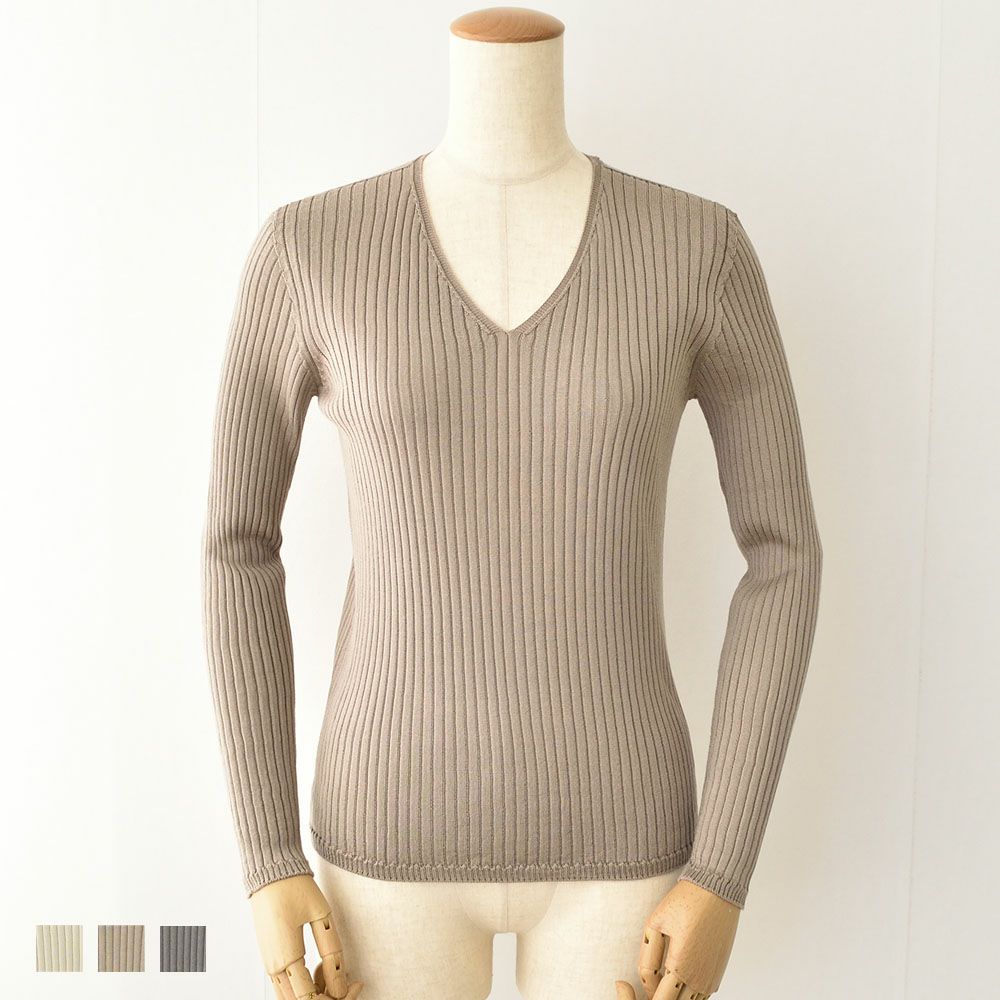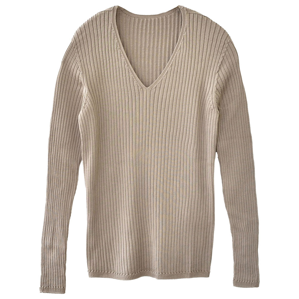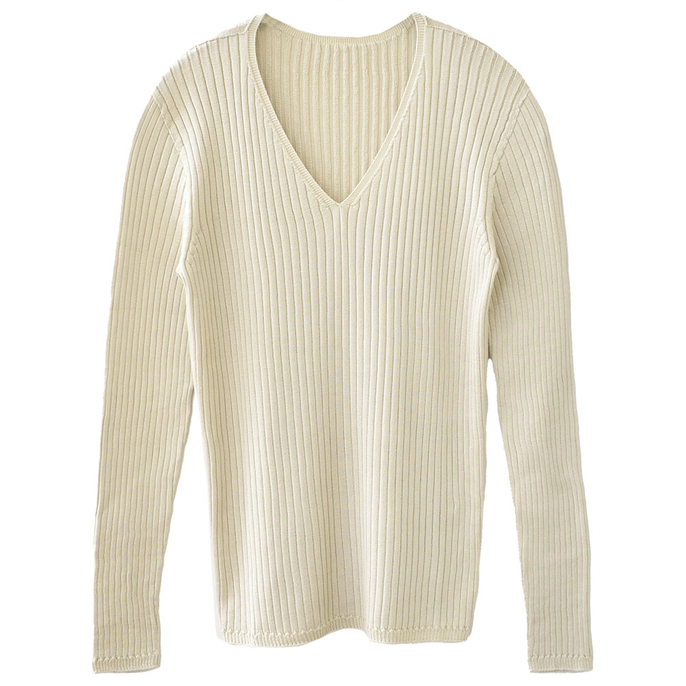 ●最高級の絹紡糸で仕立てたシルク100%の贅沢なVネックリブセーター ●ホールガーメントを使ったシームレス製法で、縫い目のゴロつきが気にならない ●調湿性に優れたシルクだから、秋から春まで幅広いシーズンでご着用頂けます