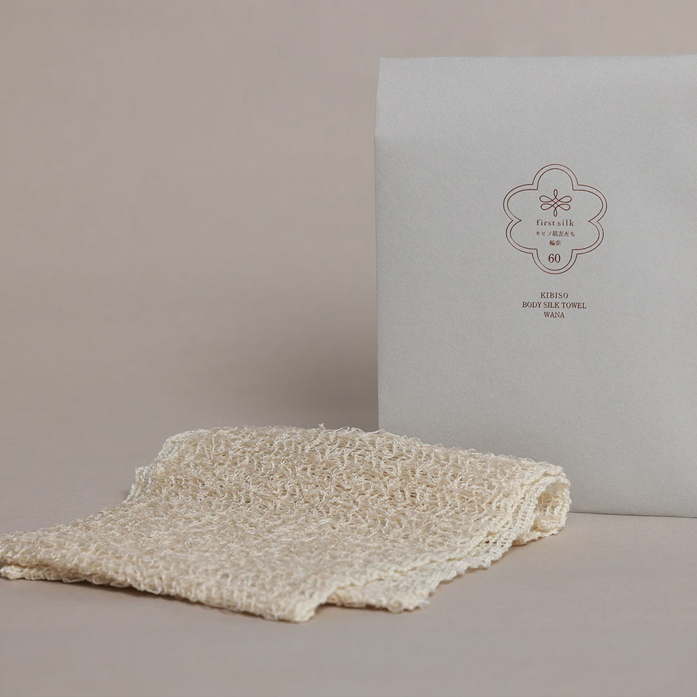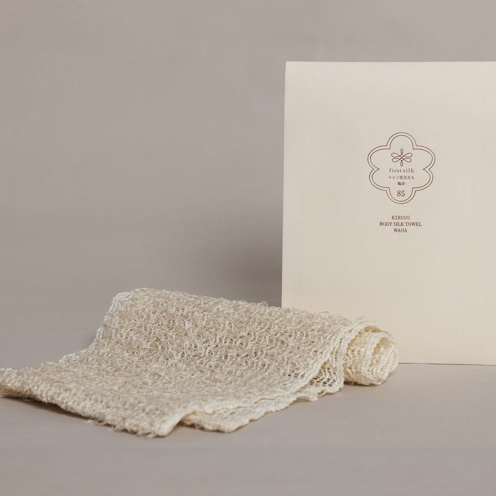 繭の一番糸「キビソ」には、美肌成分「セリシン」が豊富に含まれています。「セリシン」の保湿成分がお湯に溶けだすことに注目し、「キビソ」で浴用タオルを作りました。 洗い上がりは、しっとりすべすべで、お肌の油分をほど良く残し、セリシンを効率よく供給するためのワンランク上のタオルです。