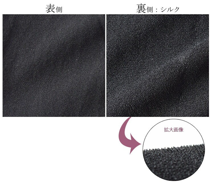 表側は一般的な化繊のタイツのような見た目と肌触りですが、肌側がシルクになるよう編まれています。 肌側のシルクは細かいパイル状になっているので、伸縮性に優れ柔らかい生地感です。さらりとした肌触りで快適にお召し頂けます。