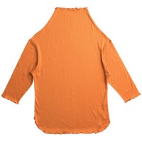 秋の差し色のおすすめは、オレンジ!意外にも合わせやすく、シャツやジャケットからチラリと覗かせても。こちらのカットソーは薄手なので、夏は一枚で、秋にはインナーとして着まわせます。