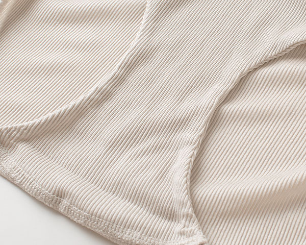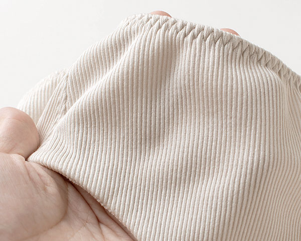 ほのかな光沢感が上品なコットンシルクのテレコ生地。テレコ素材とは凹凸のあるリブ織りの一種で、リブの凹凸が同じ数になっていて、はっきりとうねが分かるように織られています。 伸縮性がよくさらりとした肌触りで、シルク生地のなかでも比較的毛玉になりにくい素材です。