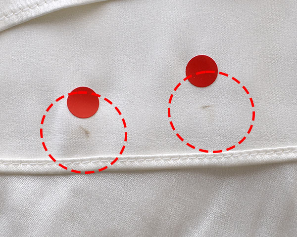 カップ布が前後ぐるりと一周ついています。バスト部分が透けにくくって、安心。 左右一体型のピーナッツパッドを使用しているから左右がずれにくく安定した着用感に。 通気性の良い穴あきタイプで蒸れにくく乾きやすいです。 ※パッドがずれないようカップ布上部と中央下部にステッチが入ります。