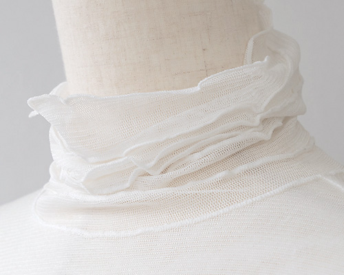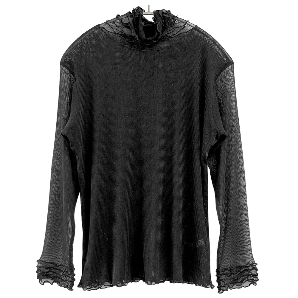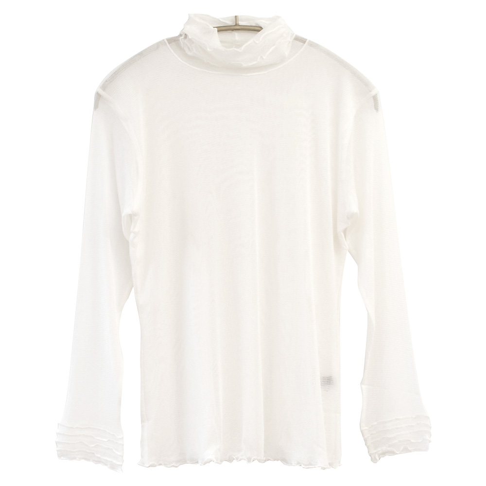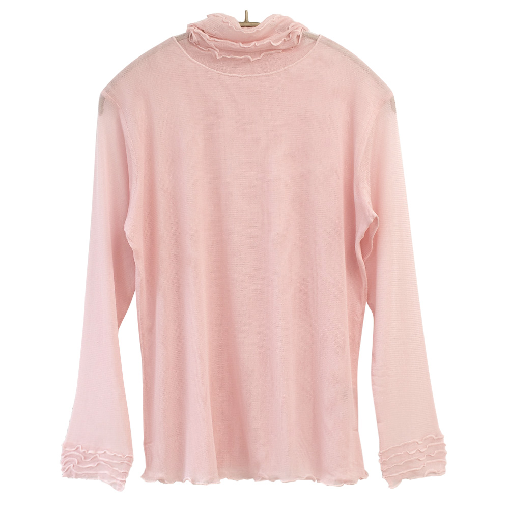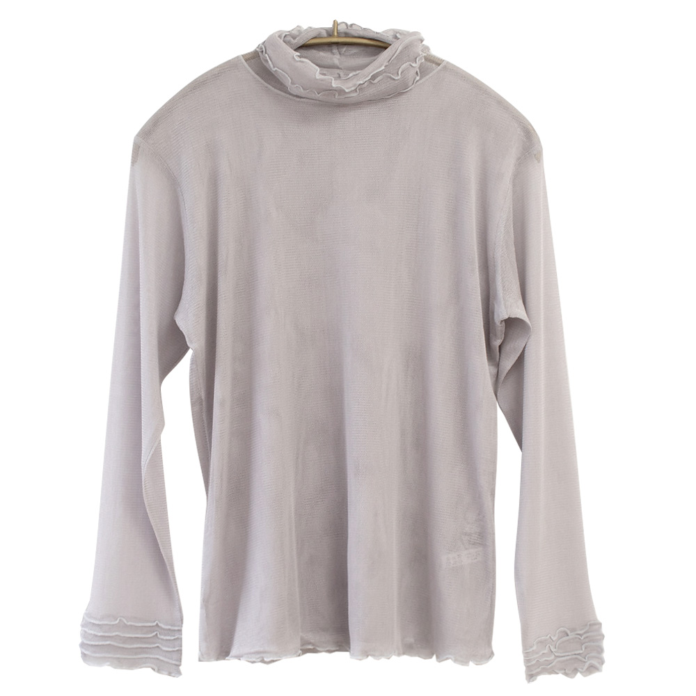 表に響きにくい薄手で軽やかなシルク100% 長袖インナー。シアー感があって、涼しげ。上品な透け感が大人のスタイルにぴったりです。首元はハイネックデザインですがとろみ感のある生地なのでクシュっとしたシルエットに。身頃は前後ともにメッシュ二重仕立てで、ネック部分とお袖はメッシュ一枚仕立てです。