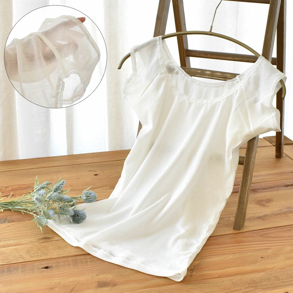 暑い日も肌に張り付かず、まるで何も着ていないかのような解放感。秘密は、空気のように軽く、風が通り抜けるコットンチュール素材にあります。100番双糸の極細スーピマ綿100%だからこそ実現した、なめらかな肌触りと抜群の通気性。さらに、汗をかいても肌側は吸放湿性に優れたシルク100%の汗取りパッドがしっかり吸収。一日中さらっと快適な着心地で、夏のおしゃれを涼やかにサポートします。