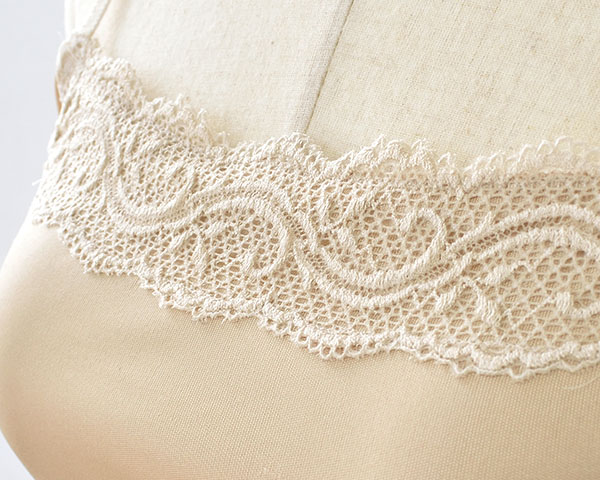 バスト部分は程よいフィット感がありつつも楽に着られる絶妙なカットライン。胸元にレースを施し、エレガントに仕上げたブラキャミソールです。