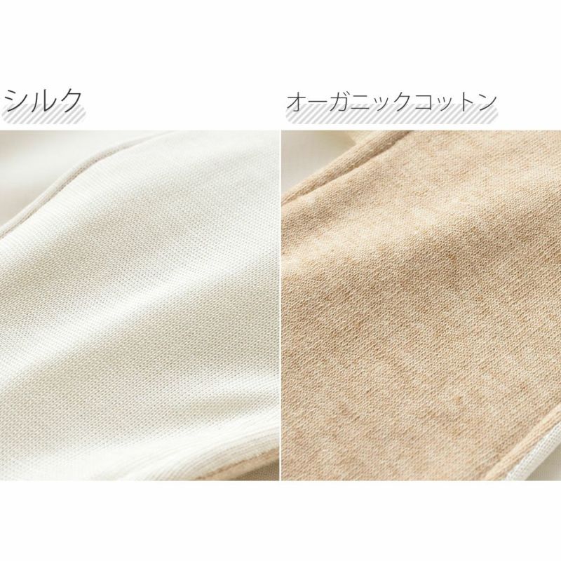 シルクはふんわりと軽やかな「ふわ肌シルク」生地を使用。ソフトで滑らかな肌触りです。シルク面、オーガニックコットン面、どちらの面でもご使用いただけます。
