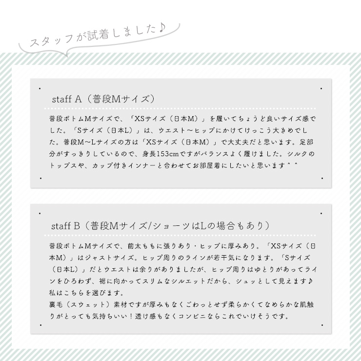 ◇XS(日本M) 対応ウエスト61-71cm 対応ヒップ86-96cm ウエストゴム(×2):70cm 総丈:95cm 股下:68cm ◇S(日本L) 対応ウエスト71-81cm 対応ヒップ96-106cm ウエストゴム(×2):74cm 総丈:101cm 股下:71cm ◇M(日本XL) 対応ウエスト81-86cm 対応ヒップ106-116cm ウエストゴム(×2):78cm 総丈:102cm 股下:72cm ※平置き実寸サイズです。 ※デリケートな素材ですので、商品によって多少の差がございます。