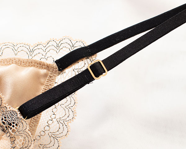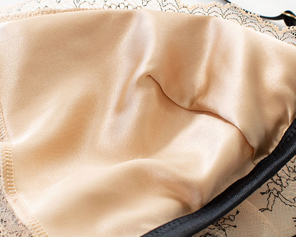 カップ裏はすべすべなめらかなシルクサテン生地を使用。 吸・放湿性に優れたシルクは汗をかいてもべたつきにくく快適。ショーツはサイドからバックにかけてレース仕立てでラインが響きにくく、 また、足繰りにゴムを使用していないため嫌な締め付けなく快適にお召し頂けます。