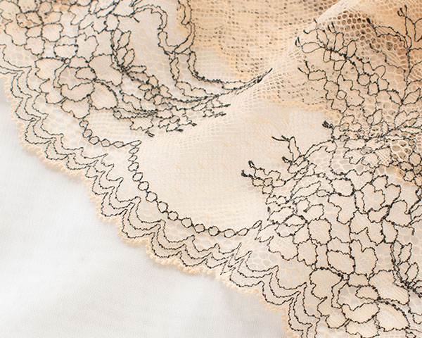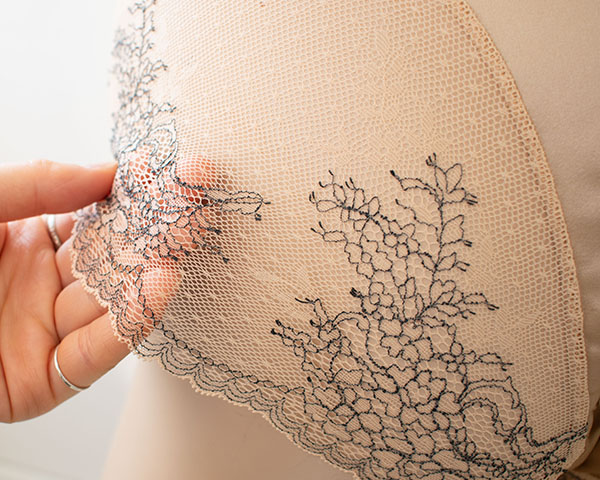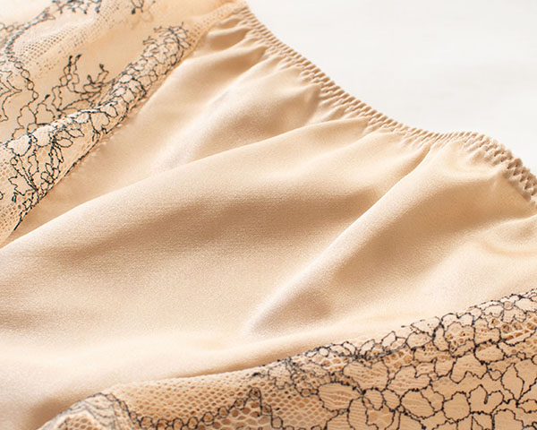 フロントはすべすべのシルクサテンで仕立て、ほんのり艶感が美しい。ヒップ側は中央がシルクサテン、サイドからヒップにかけてレース仕立てで透け感があり、レース本来の美しさを堪能できます。アウターにも響きにくく、タイトなパンツスタイルもきれいに着こなせます。