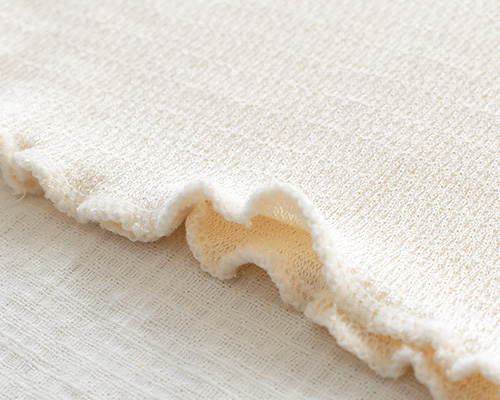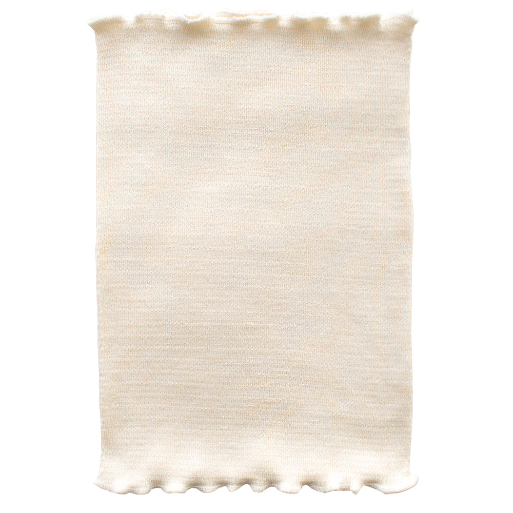 横方向の伸縮性に富んだ編み地はポリウレタンも編み込まれているため、しっかりと伸びてしっかり戻るフィット感の高い生地です。 しっとりなめらかなシルクの肌触りが素肌にここちよい。 筒状に編まれ、サイドの縫い目がないサイドシームレス仕立てでゴロつかないのもポイントです。適度な薄手生地で、重ね着しても着ぶくれしにくいです。