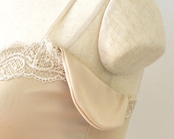 ほんのりと光沢のあるシルクに繊細な柄のレースを施したキャミソール。美しいだけでなく、脇には汗取りパッドを取り付け、汗っかきさんにもうれしいデザインに。