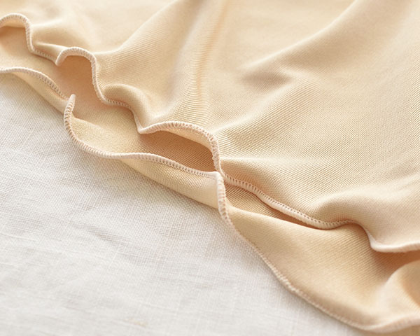 繭から最初に取り出される生糸を使用して編まれた高品質なシルク100%正絹生地。スムース編みは表面と裏面が同じ編み方のニット生地で、柔らかくとてもなめらかで気持ちの良い肌触りです。シルクジャージーに比べてしなやかで光沢感があります。100g・110gは比較的薄手で、インナーとして使いやすい厚みです。摩擦に弱く毛玉ができやすいので、お取扱いには注意が必要です 。