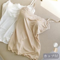 ●正絹シルクスムース素材にカップと汗取りパッドを取り付けたキャミソール ●表も裏もすべすべ、高級感のあるなめらかな肌触り ●胸元にレースを施したラグジュアリーな一枚