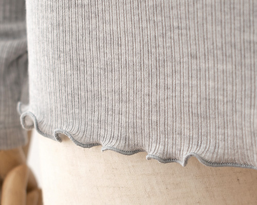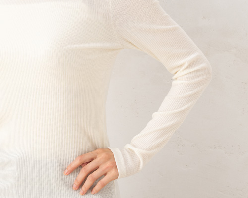 再生繊維リヨセルに、シルクとカシミヤがブレンドされた薄手のテレコ生地。ストレッチ性が高く、とろんとしたとろみ感が心地いい滑らかな肌触り。控えめな光沢感が上品です。