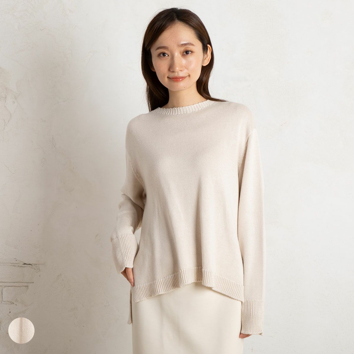 高品質な厳選シルクを世界各国に提供している「長谷川商店」のシルク糸を使用し、 クルーネック長袖ニットを作りました。シルク糸の表面をふんわり毛羽立たせたふわふわ加工が施され、ニットとは思えないようなすべやかな肌触りに癒やされる一枚に。また、ホールガーメントを使ったシームレス製法で編まれているので、 着用時のストレスの原因になる縫い目 繋ぎ目がありません。 保温・保湿性に優れたシルクですから、しっとりとお肌に馴染み、やさしいぬくもりに包まれます。手洗いOK、こだわりの日本製です。■スタッフの愛用品