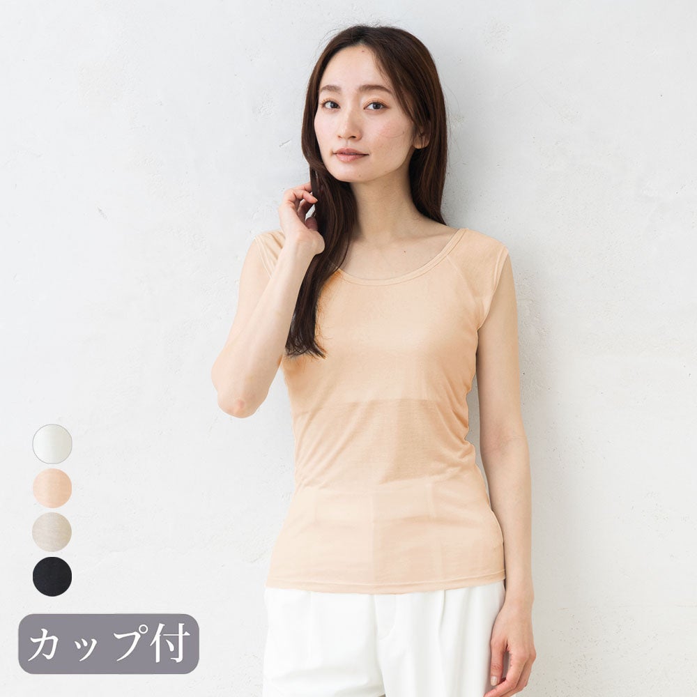 ●薄手のシルク100%生地で、ふんわりと軽く、ソフトな生地感 ●ブラなし楽ちん。汗取り機能が一緒になったカップ付きインナー ●吸放湿性や保温性に優れたシルクだから、汗ばむ季節の汗取りや、冷えとりインナーとして一年中活躍 ●【ブラック】は特殊なウォッシャブル加工を施し、色落ちや毛羽立ちを抑え、洗濯機で洗えます