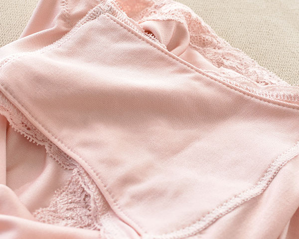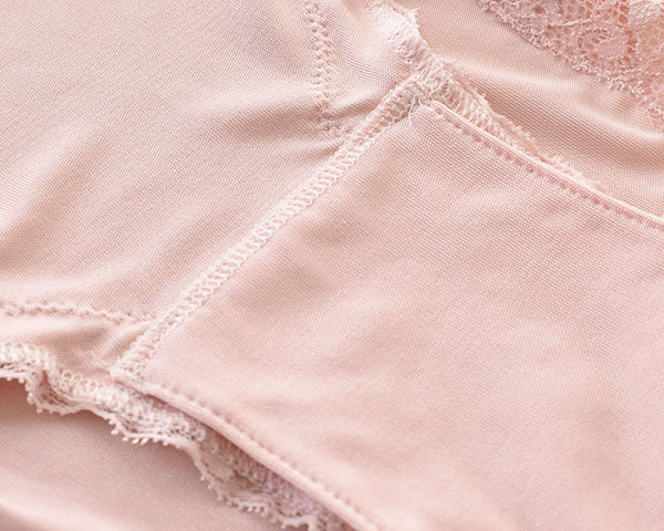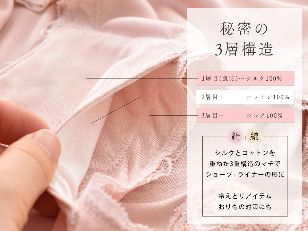 マチ部分はシルクとコットンの3層構造、ショーツとライナーが一体化した形で、ひそかに冷えとり対策も。市販のおりものシートだとかぶれてしまう…ライナーをつけるとズレるかも…と不安な方にもおすすめしたいショーツです。お肌に当たる面は身生地と同じシルク100%生地なので敏感肌さんも安心の肌触り。
