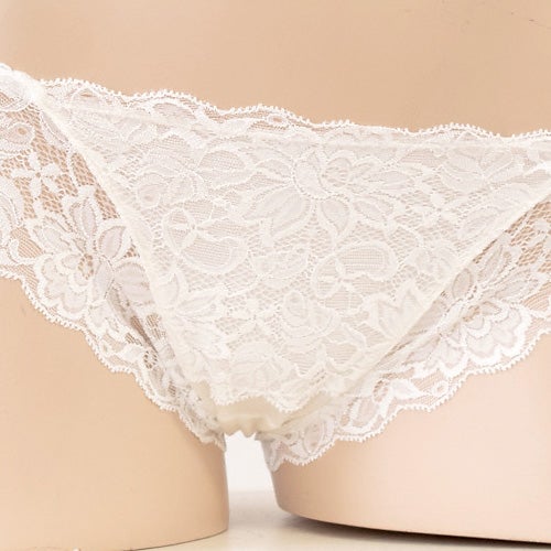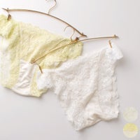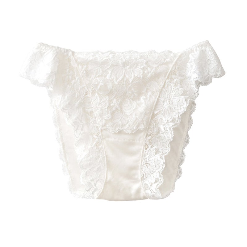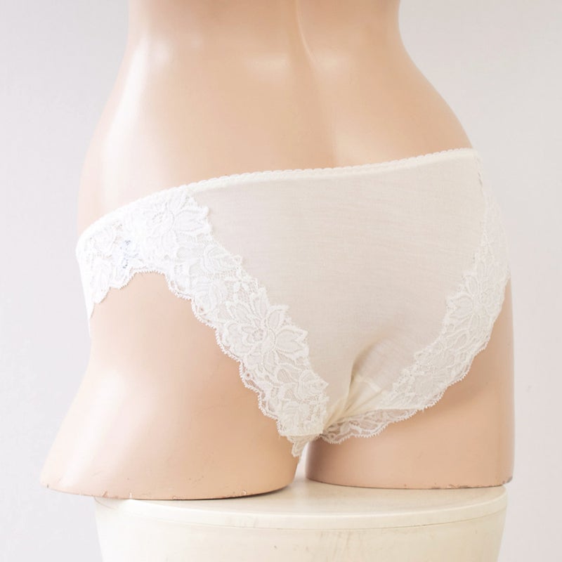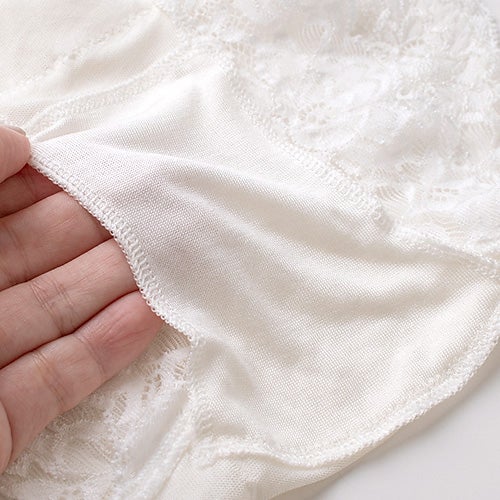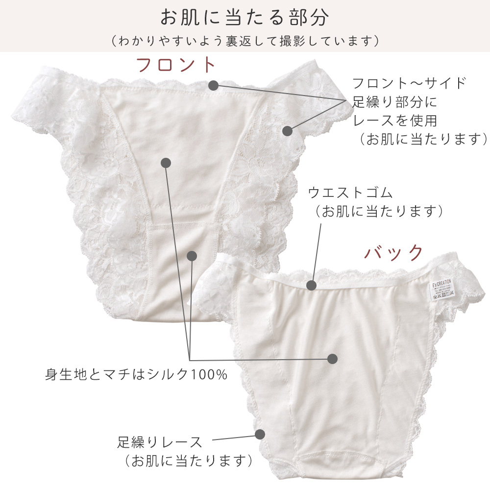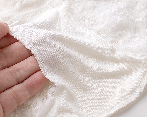 足繰りにはゴムの代わりにストレッチレースが施されているので、程よいホールド感がありつつも、食い込みがなくアウターにも響きにくいのがポイント。フロント・マチ・ヒップ部分はシルク100%の身生地の上にレースを乗せているので、しっとりとソフトなシルクがお肌にそっとやさしく寄り添ってくれる、癒しの肌触りです。