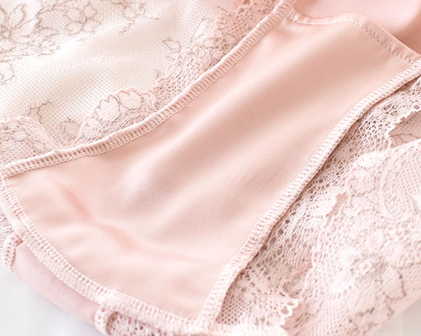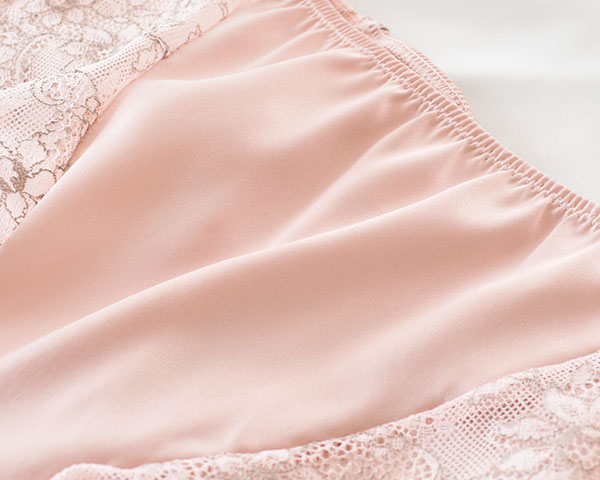 フロントはすべすべのシルクサテンで仕立て、ほんのり艶感が美しい。シルク特有のしっとりした肌触りと艶感を持つシルクサテンは、汗をかいてもべたつきにくく、快適に過ごせます。 ヒップ側は中央がシルクサテン、サイドからヒップにかけてレース仕立てで透け感があり、レース本来の美しさを堪能できます。アウターにも響きにくく、タイトなパンツスタイルもきれいに着こなせます。