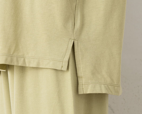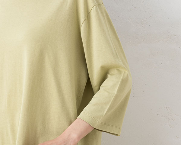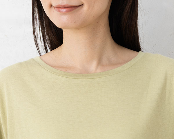 コットンのやさしい風合いにレーヨン特有のとろみ感が合わさった、ソフトで滑らかな肌触り。こちらは天竺編みで軽くふんわりとした風合いです。