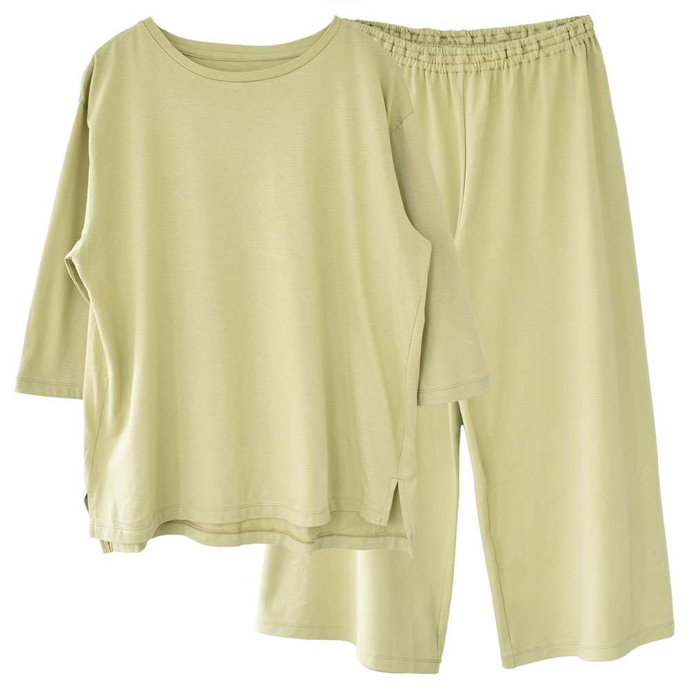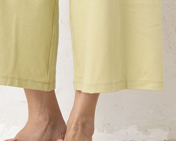 コットンのやさしい風合いにレーヨン特有のとろみ感が合わさった、ソフトで滑らかな肌触り。トップスとパンツで生地の編み方が異なり、トップスは天竺編みで軽くふんわりとした風合い。パンツはスムース編みで比較的厚みがあります。