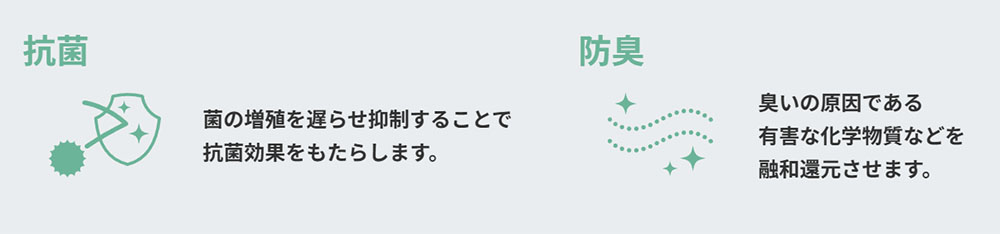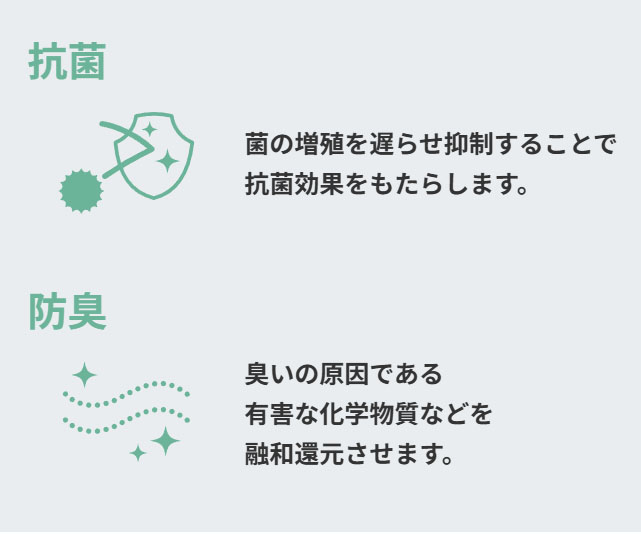 「イタドリ」「よもぎ」「柿の葉」のポリフェノール成分をレーヨンに練りこみ、綿と混紡した機能糸です。 天然繊維ならではの風合いに機能が備わったハイブリット素材です。