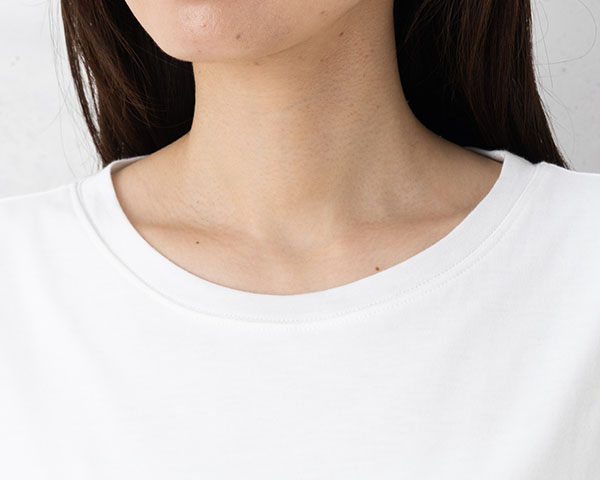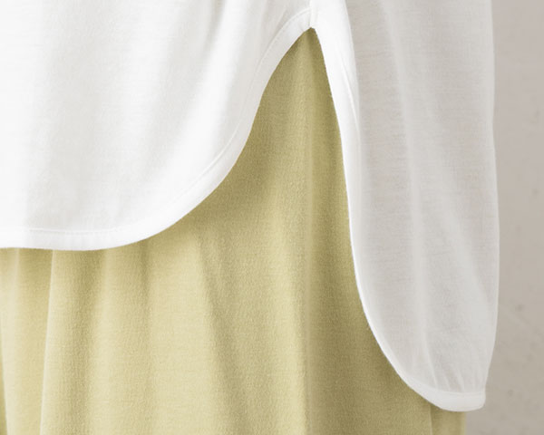 コットンのやさしい風合いにレーヨン特有のとろみ感が合わさった、ソフトで滑らかな肌触り。こちらは天竺編みで軽くふんわりとした風合いです。