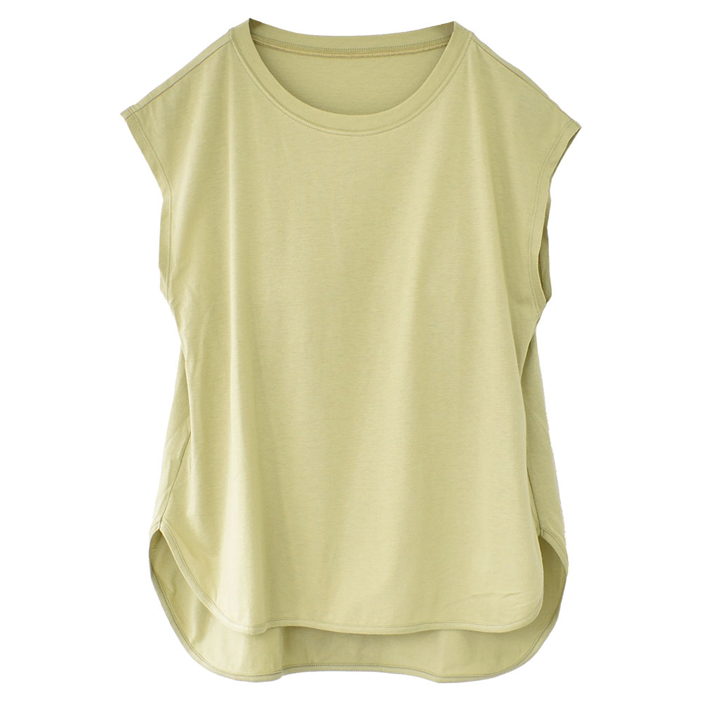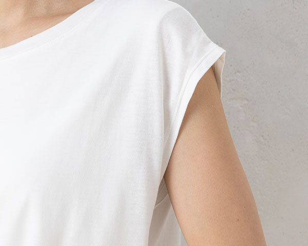 ゆとりのあるシルエットでウエスト・ヒップまでカバーしてくれるカップ付きフレンチ袖トップス。 デコルテ付近を上品ですっきりした印象にすることで、スマート見えを実現。
