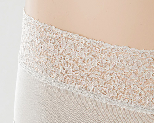 ●シルクの身生地にレースを施した、エレガントなデザイン ●素肌に心地よいシルク生地は薄手でお肌に馴染む優しい履き心地 ●ウエストレース&足繰りレースはソフトで締め付けがなく幅広だから安定感のあるフィッティング