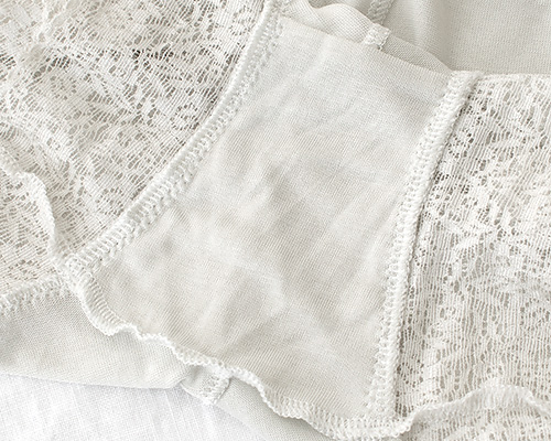 ウエストと足繰りはゴムを使用せず幅広レースを使用して柔らかく締め付けのない履き心地に。程よいフィット感がありつつも食い込みにくく響きにくい。しっとりソフトなシルクがお肌にそっと優しく寄り添ってくれる、癒しの肌触りです。