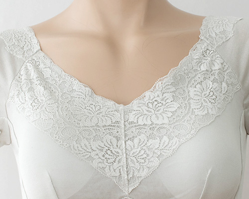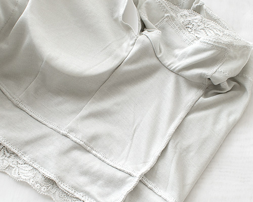ふんわりと柔らかく、さらっとお肌に馴染むシルク100%生地に、上品なディテールのレースを施しエレガントに仕上げたシリーズ。 身生地はシルク100%でシルク特有のしっとり感を味わうことができます。100g-110gの比較的薄手のシルク生地は、インナーとして使いやすい厚みで、ほんのりと透け感があり、落ち着いた光沢感になります。