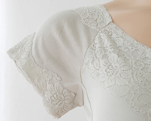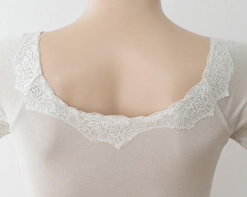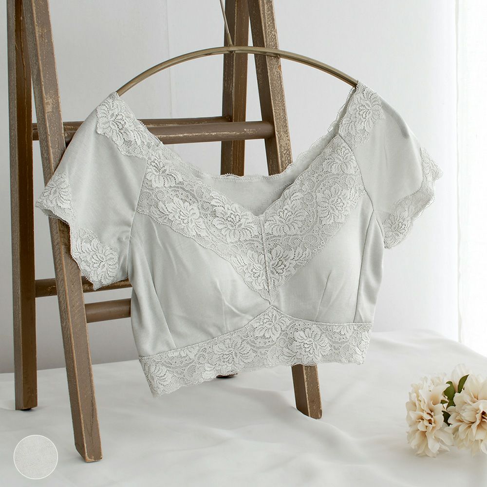 ●シルクの身生地にレースを施した、エレガントなデザイン ●吸放湿性や保温性に優れたシルクだから、汗ばむ季節の汗取りや、冷えとりインナーとして一年中活躍 ●ブラジャーのいらないカップ付きで締め付けがなく楽ちん