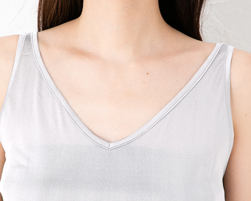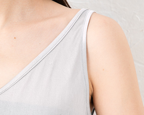涼しい薄手のシルク100%天竺ニットを使用したタンクトップは、シンプルなデザインで、 アウターにひびきにくいシルクのインナーです。意外と汗かく背中の汗もしっかりキャッチ!ハイバック仕様に仕立てました。シルク効果で、まるで天然の除湿器を纏っているように、湿気を取り除き、お肌もすべすべさらさらに。汗だくの戸外からクーラーの効いた部屋に入っても、汗を素早く蒸発させるので、身体を冷やす心配も軽減。一枚纏うだけでとても心地よいシルクのタンクトップだから、 下着の透け防止にはもちろん、汗取り・冷えとりインナーとしてもオススメ。キャミソール風に見える肩紐の細さにもこだわりました。