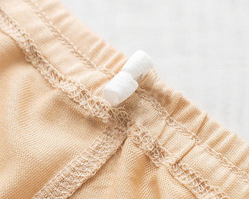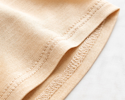 肌側の縫い目は、縫い代を寝かし、ステッチで押さえる二度縫い仕上げで、お肌への負担を軽減しています。