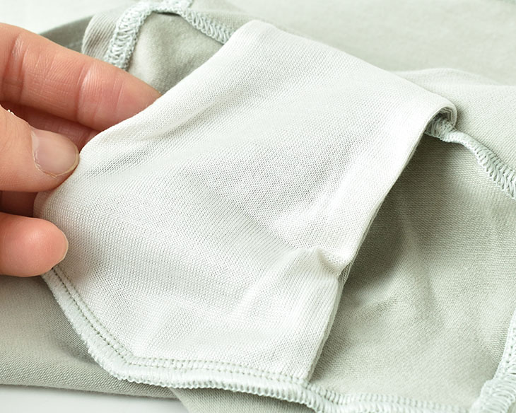 身生地は少しハリのあるソフトなコットン生地。伸縮性があり伸び良い生地なので、ゴムを使用しなくても程よいフィット感。深履きタイプでヒップすっぽり安定の履き心地です。マチ裏は吸放湿性に優れたシルク生地を裏打ちしたことで、嫌なムレ感が軽減され、快適。心地よい肌触りと、締め付けのない楽な穿き心地に ココロもカラダも癒やされる一枚です。