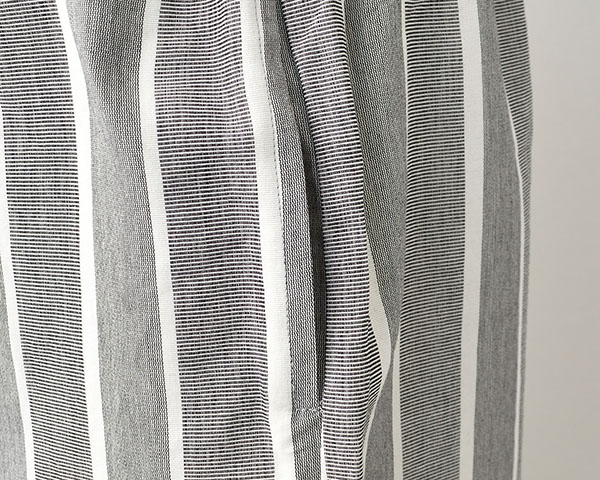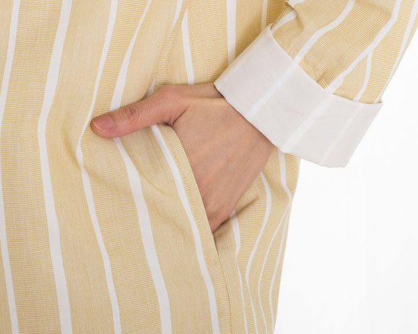 紙特有の適度なハリ感と軽さ、さらっとしたドライな風合いが春夏に最適な和紙混素材。 ワッシャー仕上げで天日干し風のナチュラルなふくらみを出しています。 光をかざすとうっすらと透ける程よい厚みです。 ※袖口と裾の内側の生地はコットン100%です