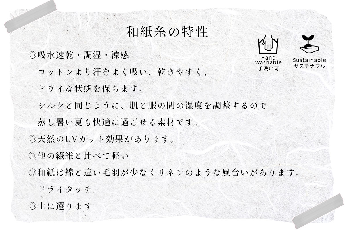 日本古代より続く『和紙』が、高度な日本の技術で衣類になりました。 和紙といえば障子や襖を思い浮かべますが、 これらは吸湿性や消臭効果・断熱性・紫外線カット力があり、日本の夏を快適に過ごせ、また、冬も温かく過ごせる日本古来からのアイテムです。