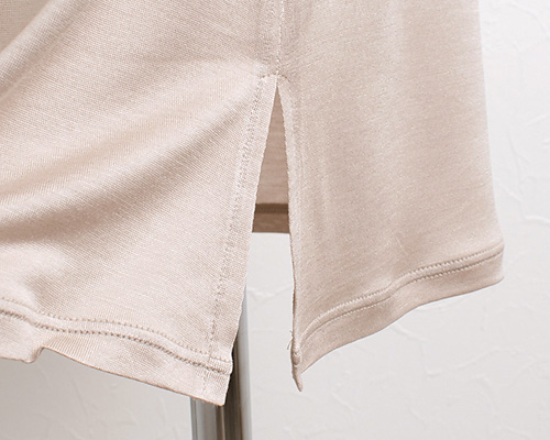 柔らかくふんわりとしたシルク100%生地で、やさしい肌触りに癒やされます。薄手でお肌に馴染みやすく、まるで第二の皮膚のように自然な着心地。 インナーとして使いやすい厚みです。落ち着いた光沢感。